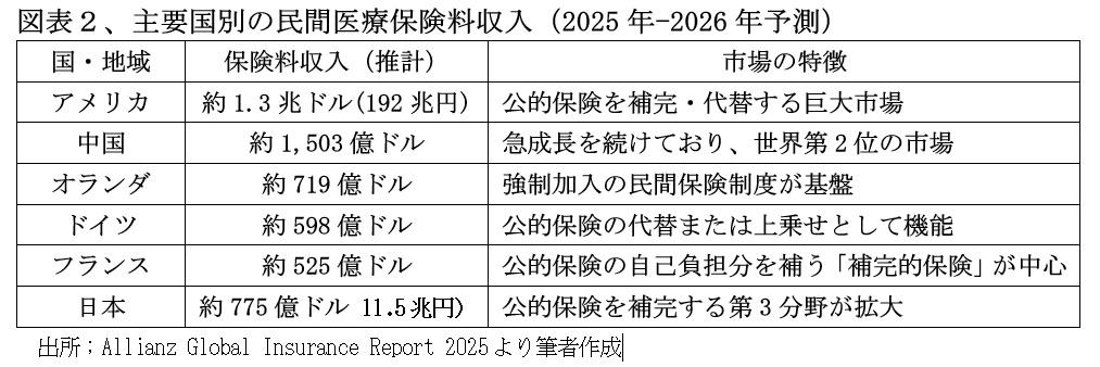 その結果、欧米諸国では民間の医療保険市場が拡大しており、米国は別格としても、人口規模が日本の1/2程度の独・仏・オランダでは人口比で見れば民間保険の方が2倍ほど大きな市場となっている。(図表2)