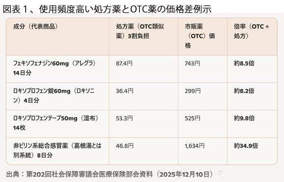たとえば、毎年ほぼ確実に罹患する花粉症は、医療費負担も小さいので、保険でカバーする必要性は低い。国はこうした軽症には「セルフ・メディケーション税制」で市販薬購入を推奨しているが、実際には「医者に行って3割負担で薬をもらう方が安い」という逆転現象が起きている。同じ薬効なのに、処方箋薬の方がはるかに安価で、OTC薬は高額なのである。(図表1) 多忙で医療機関に行けない現役世代は、この逆転現象に対して苦々しい感情を持っている。